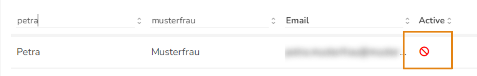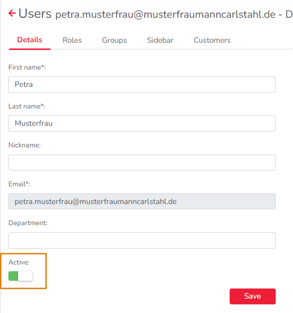 Open the user by clicking on the line and stay in the tab Details. Here you set the switch from "active" to "inactive" to inactivate the user. This can be seen by the color change from green to red. Save the process by clicking on the Save icon. Whether a user is active or inactive can also be seen directly from the user overview in the previous window. Active users have a green check mark in the "Active" column, while inactive users have a red crossed-out circle.