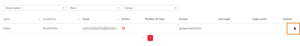 If you are 100% sure that the user has left the company permanently, e.g. because he has retired, the user can be deleted. In this case use the trash can icon of the Actions column on the right side of the user table. By clicking on the trash can of the corresponding user, this user will be permanently deleted. Access to the portal is no longer available, and it cannot be reactivated.