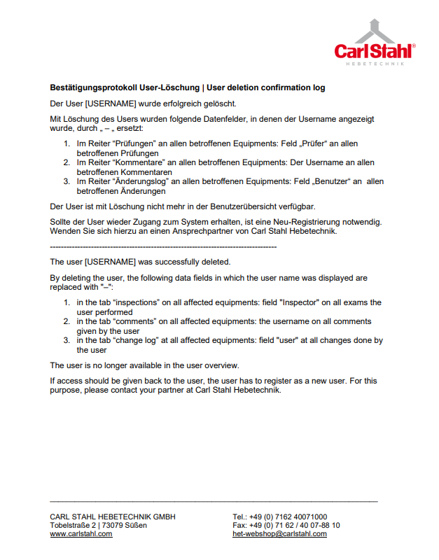 If a user is to be created again after deletion, it must be activated by Carl Stahl Support. Please contact your Carl Stahl contact person for this purpose.