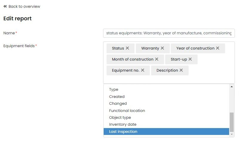 If you want to create a new report, you can choose from a list of equipment characteristics what should be included in your report. Select the data you need by clicking on the "EQ fields" field. A list of various characteristics will appear, which you can add to the report by clicking on them. After assigning a meaningful name to the report, you can click "Save" to create the report. From now on it is permanently available in your report list (see screenshot above) and can be exported again and again.